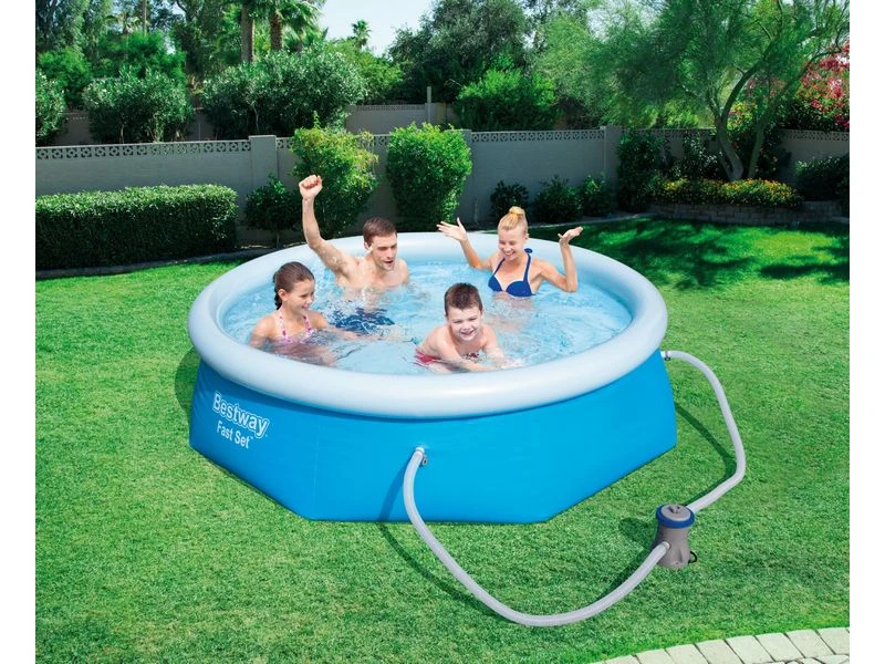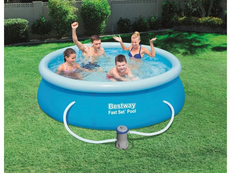 Rond zwembad met opblaasrand. Snel en simpel op te zetten, zonder gereedschap. Van duurzaam Tritech materiaal, bestand tegen UV stralen en chloor. Getest op gewicht en druk van grotere hoeveelheden water. Incl. 12 V. cartridgefilter van 1,2 m³/u.. Cartridge type I. Watercapaciteit (80%): 2.300 liter. Afmeting: 244×66 cm.