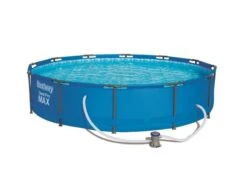 Rond stalen frame zwembad. Uitgerust met framelink systeem met corrosiepreventie, een 3 laags PVC band ter ondersteuning, kunststof hoekstukken en 2 bekerhouders. Zeer gemakkelijk te installeren. Van duurzaam Tritech materiaal, bestand tegen UV stralenen chloor. Incl. 12 V. cartridgefilter van 1,2 m³/u. Gemiddeld 1x per 2 weken cartridge vervangen, cartridge type I. Watercapaciteit (90%): 6.473 liter. Afmeting: 366×76 cm.