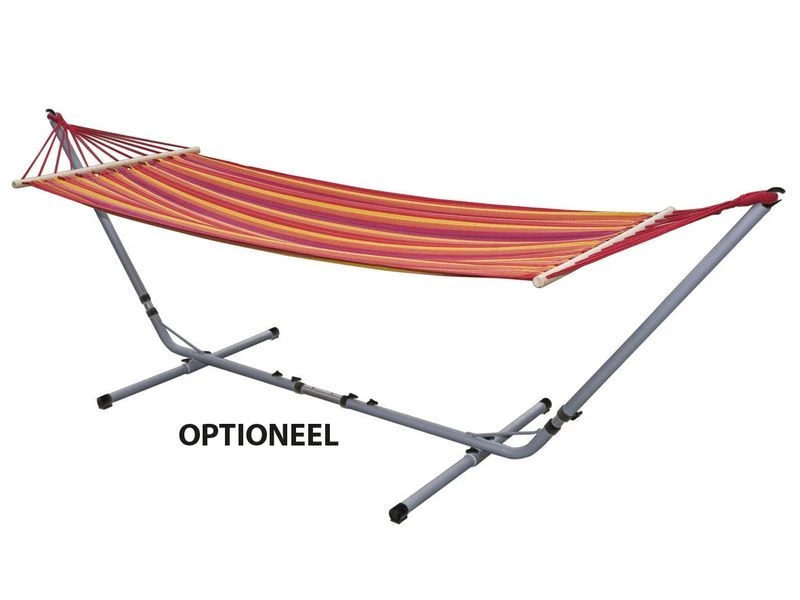 Een vrolijke en stevige hangmat. Heerlijk ontspannen op vakantie, in de tuin of op het balkon. Gemaakt van stevig 320gr/m² katoen/polyester. De hangmat beschikt over een spreidstok van 100 cm aan de uiteinden waardoor de stof volledig open blijft. Maximaal draagvermogen: 150 kilogram.
