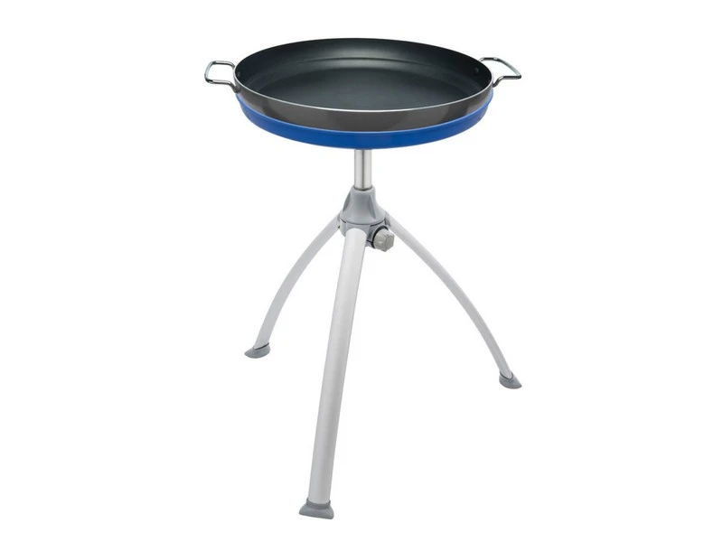 Het onderstel is hetzelfde: lichtgewicht aluminium poten, die eenvoudig los te schroeven zijn. In plaats van een Skottel wordt deze versie geleverd met een grote paella pan (47cm) van hoogwaardige kwaliteit.