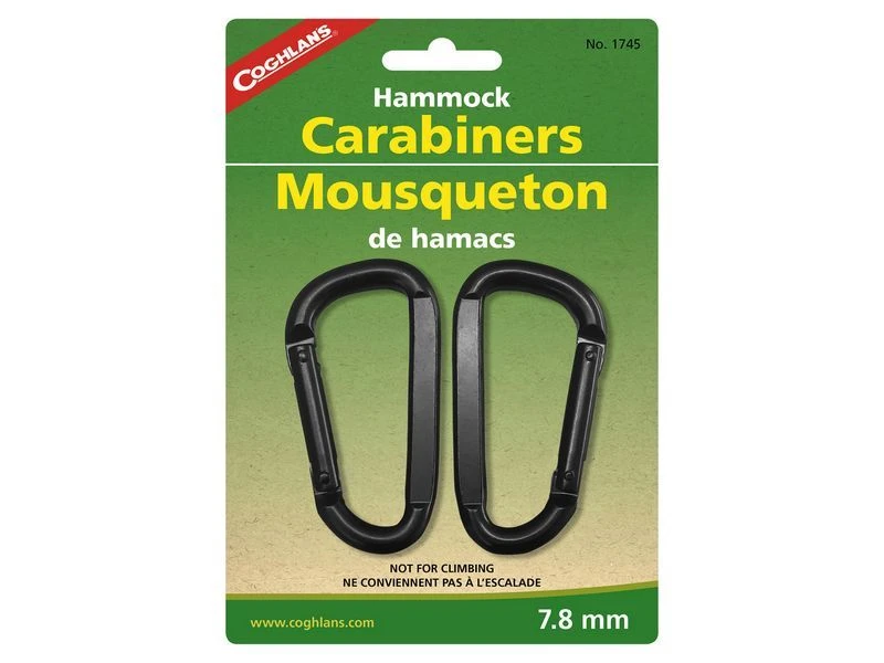 Een set van 2 carabiners zoals ook bij de parachute hangmatten zijn inbegrepen. Deze carabiners zijn zeer sterk en ontworpen voor het aansluiten van hangmatten aan haken. De carabiners beschikken over afgeronden hoeken waardoor ze nooit de stof of riemen van de hangmat zullen beschadigen.