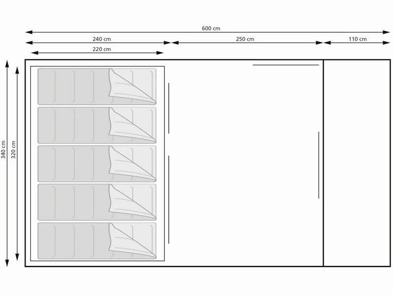 Familietent vervaardigd van het ademende polyester/katoen materiaal en geschikt voor 5 personen. Ruime leefruimte met grote heldere afsluitbare ramen rondom en een mooi panoramisch uitzicht. Zijdeur met regenluifeltje en mesh deur. De leefruimte biedt veel ruimte voor kampeer meubilair en bagage en heeft een volledig genaaid grondzeil. Het voorpaneel heeft grote heldere ramen en een extra mesh deur. De diepe vast voorluifel beschermt u tegen slecht weer, maar biedt u ook een perfecte schaduwplaats om te zitten en te ontspannen. Grote binnentent met scheidingswand is te splitsen in een ruime 3 persoons en 2 persoon cabine is tevens voorzien van en handige organiser in de voorwand en mesh pockets aan de binnenkant.