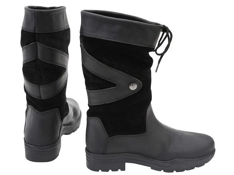 Zwarte leren laars. Hoog model. Voor haar. Stevige zool voor alle weersomstandigheden, waterdicht en met wol gevoerd in de schacht. Comfortabel voetbed voor optimale pasvorm. Wandelen maar.