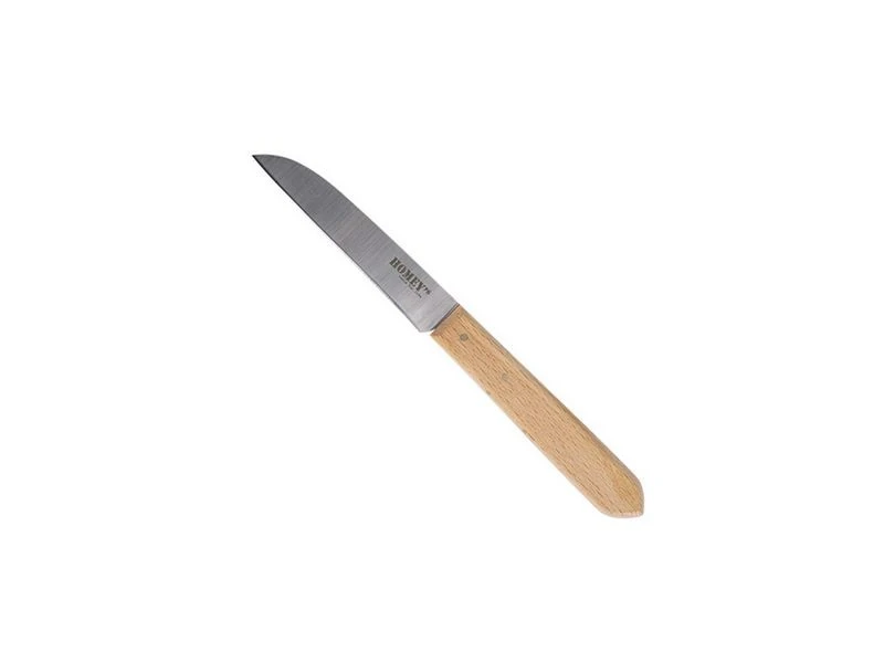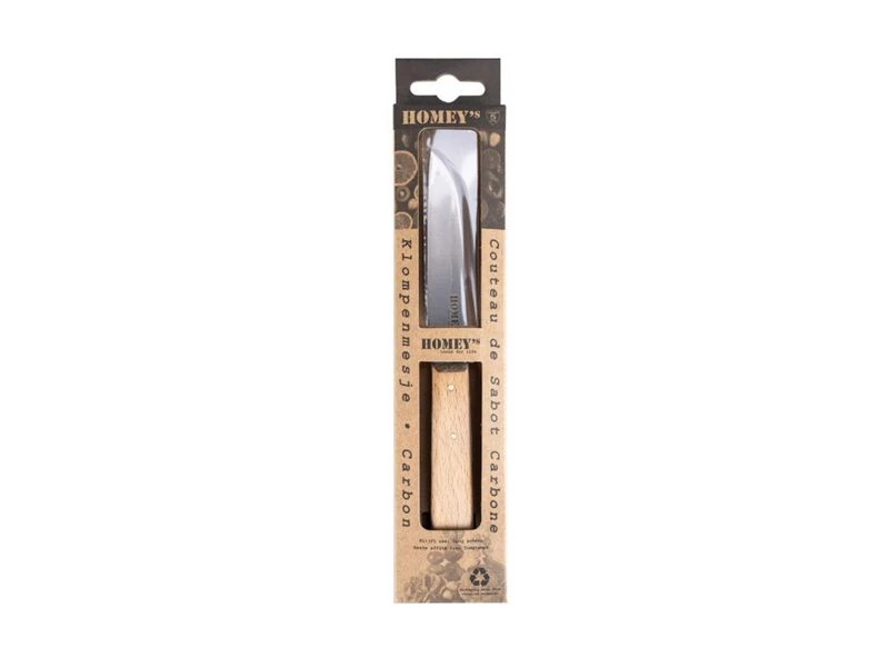 Homey’s Klompenmesje. Een typisch Nederlands mesje: werkt hard en is super efficiënt! Het 9 cm lange lemmet is gemaakt van carbon staal waardoor dit mes lang scherp blijft. Het heft is gemaakt van tijdloos beukenhout. Verpakking: Blister.