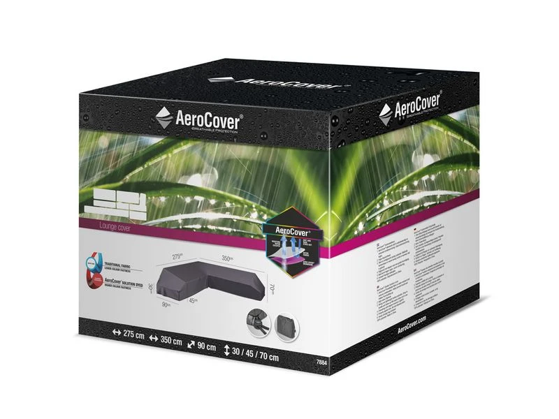 Loungesethoes van AeroCover. Ademende loungesethoes voor loungesets met platform links 350x275x90xH30/45/70. AeroCovers zijn ademend, waterbestendig, reduceren condensvorming en gaan schimmelvorming tegen. Wanneer u in de set zit is de linkerzijde langer dan de rechterzijde.De stof heeft een hoge kleurechtheid dankzij de door en door geverfde vezels. Een AeroCover hoes verlengt de levensduur van uw tuinmeubelen. AeroCovers zijn vervaardigd van sterk en lichtgewicht ripstop polyester. Ze zijn makkelijk hanteerbaar en nemen weinig ruimte in wanneer niet in gebruik. De afdekhoes is voorzien van rijgkoord met 2 stoppers voor een goede pasvorm. Inclusief handige opbergtas. AeroCover stoffen zijn 100% waterdicht, de naden zijn, net als elke ander hoes, spatwaterdicht.