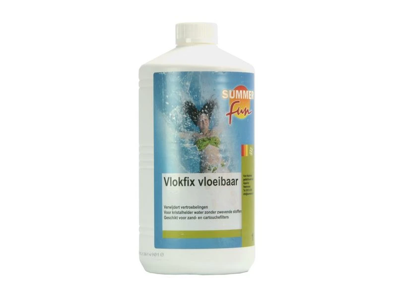 Summer Fun Vlokfix vloeibaar, 1 liter. Bindt kleine zwevende vuildeeltjes in het zwembad, zodat ze door het filter kunnen worden opgevangen. Geschikt voor zand- en cartridgefilters. Nooit mengen met andere (zwembad) chemicaliën, altijd het product aanwater toevoegen, nooit andersom. Verpakking 1 liter.