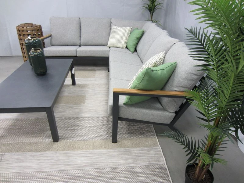 De 5-delige Paleros hoek-lounge set is gemaakt van een aluminium frame. De zitting en rugleuning zijn bekleed met aluminium latten. De armleuningen zijn afgewerkt met teakhout. De set wordt geleverd inclusief zit- en rug kussens. Deze hoek-lounge-set bestaat uit twee 2 2-zits lounge-banken, een corner deel, een centerdeel en een tafel. De totale afmeting van de set is 215 x 275 cm. De tafel heeft een afmeting van 130 x 67 x H 44 cm.